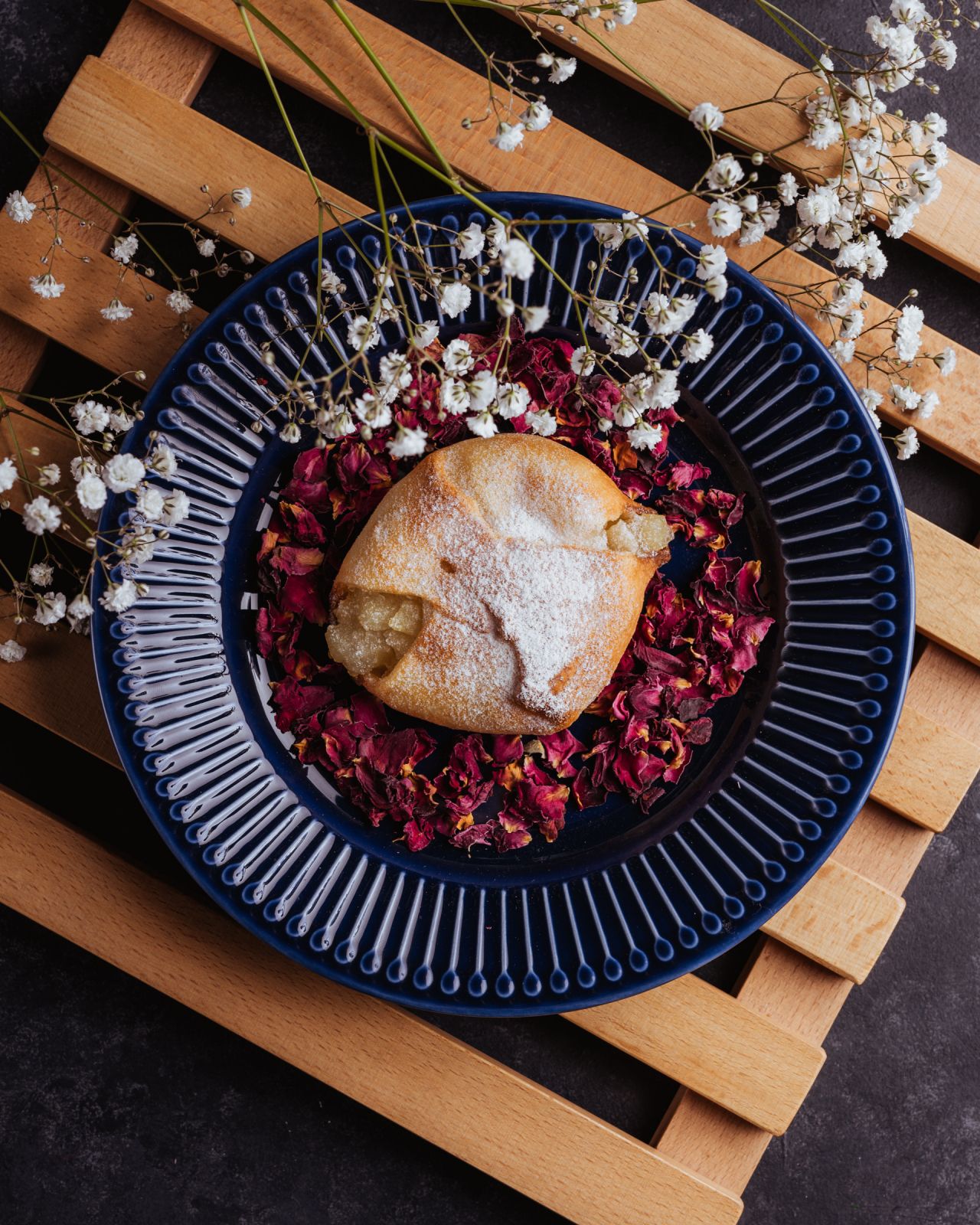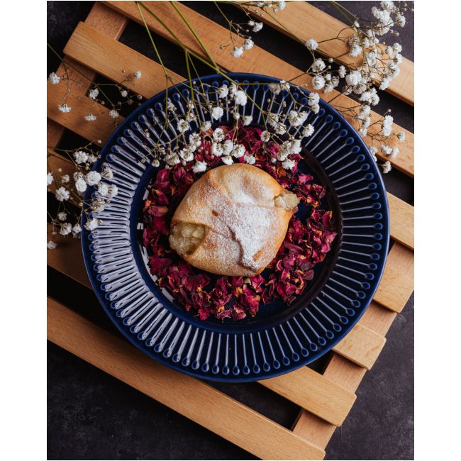 Słodka przekąska w formie koperty z zamkniętym wewnątrz jabłkiem.