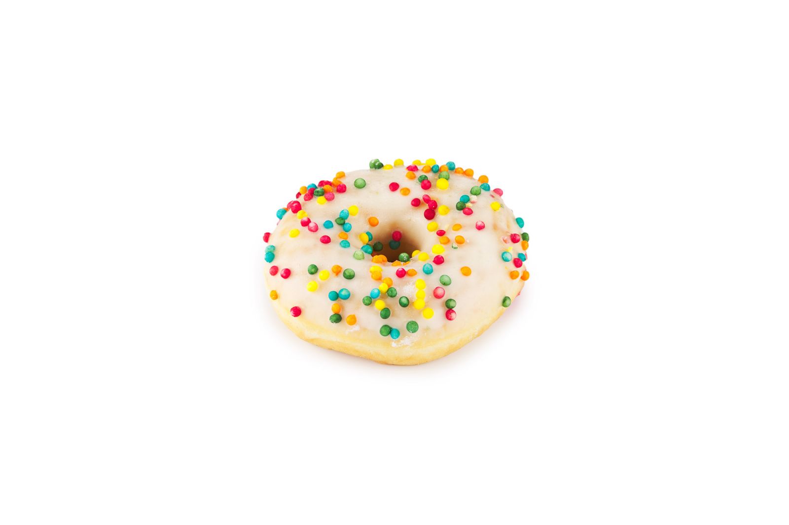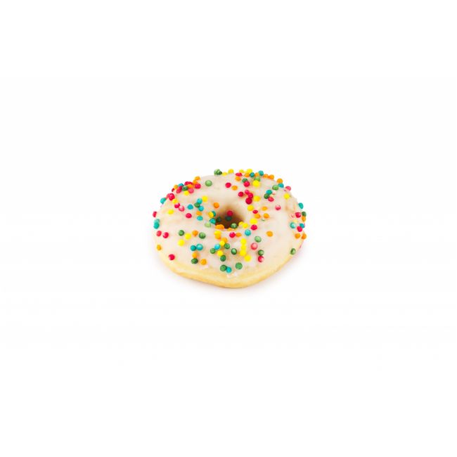 Ciasto drożdżowe w charakterystycznym kształcie oponki z dziurką, oblane białą polewą i udekorowane kolorowymi kuleczkami.