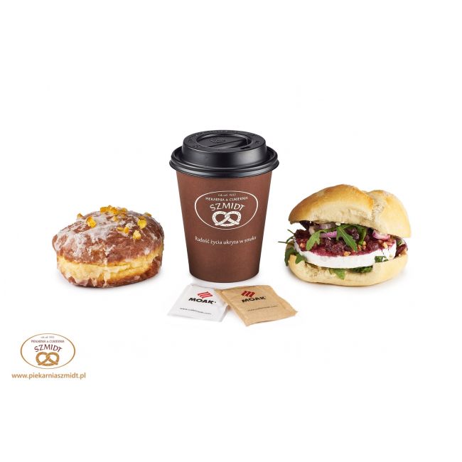 Zestaw dla 1 osoby składający się z dowolnej kawy białej lub czarnej z dodatkiem cukru białego lub brązowego (2 saszetki), kanapki oraz pączka.