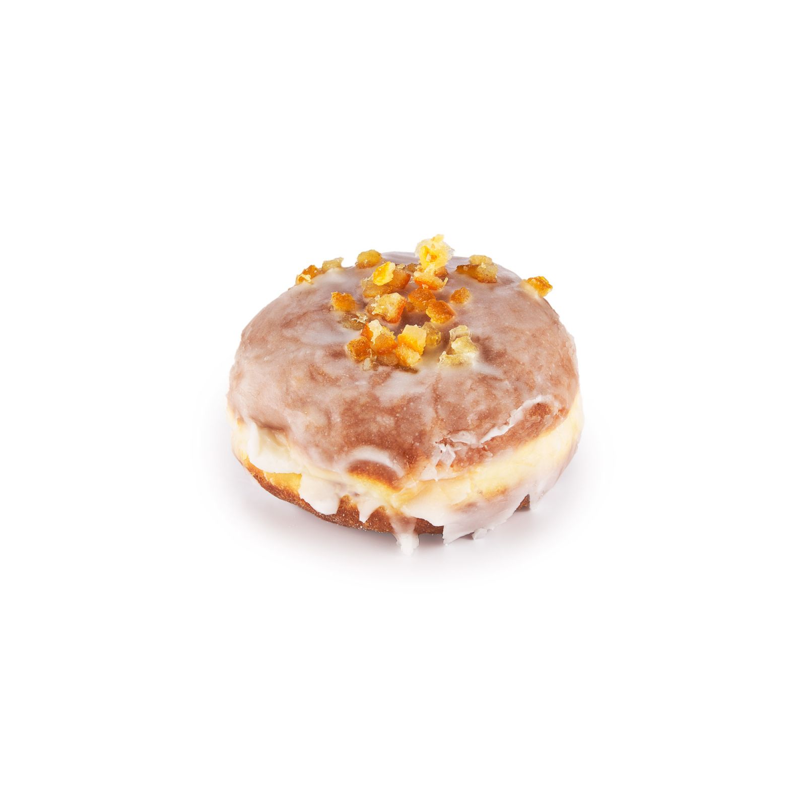 Tradycyjny pączek z nadzieniem z płatków róży, oblany lukrem i posypany kandyzowaną skórką pomarańczową.