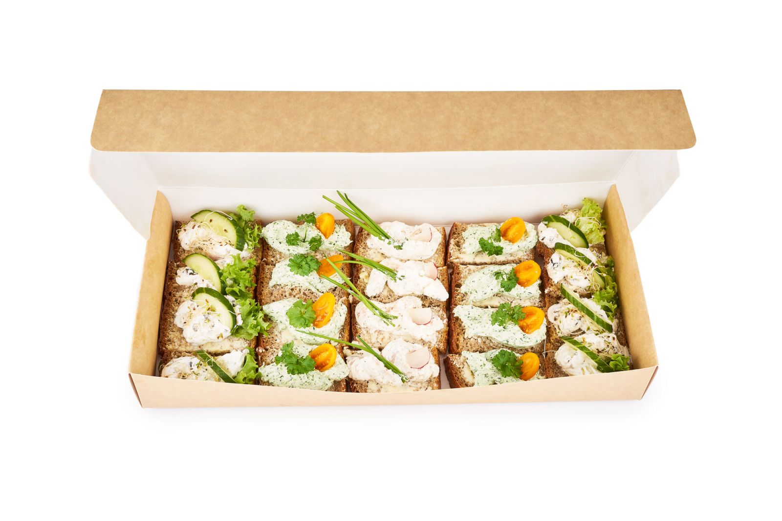 Mini kanapki z różnymi rodzajami past na dwóch rodzajach ciemnego pieczywa.