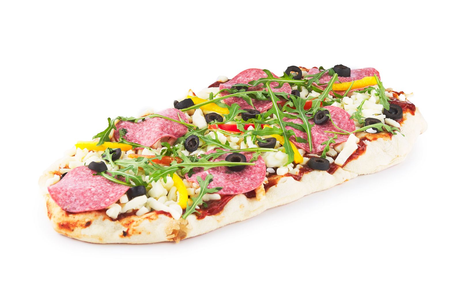 Podłóżne pół zapieczone spody z dodatkiem papryki, salami, rucoli, sera mozzarella wiórki, oliwki ciemne, przesmarowane sosem do pizzy = to idealne wytrawne przekąski we włoskim stylu.