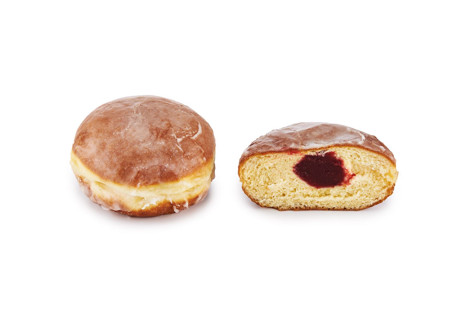 Tradycyjny pączek z marmoladą wieloowocową, oblany lukrem.