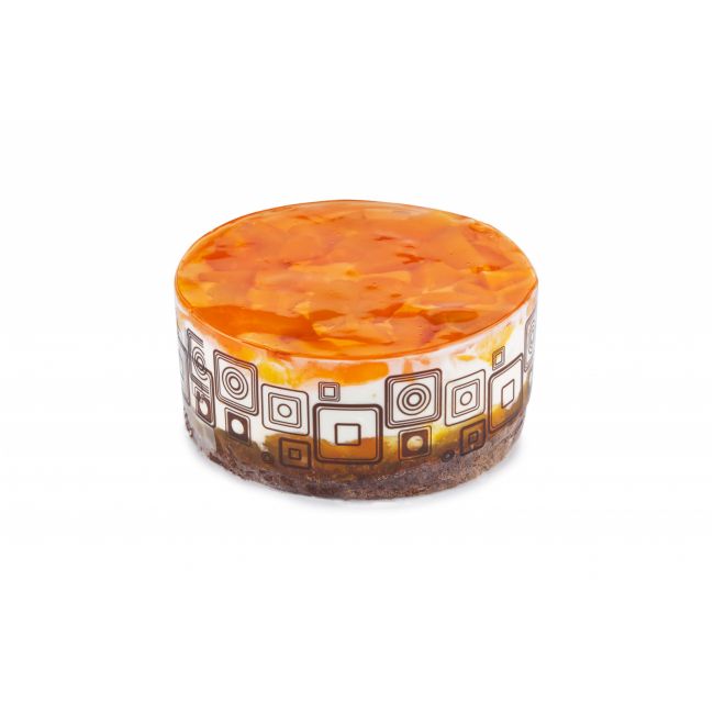Ciemny biszkopt przełożony dżemem truskawkowym, z warstwą delikatnego sera, wykończony owocami w galaretce.