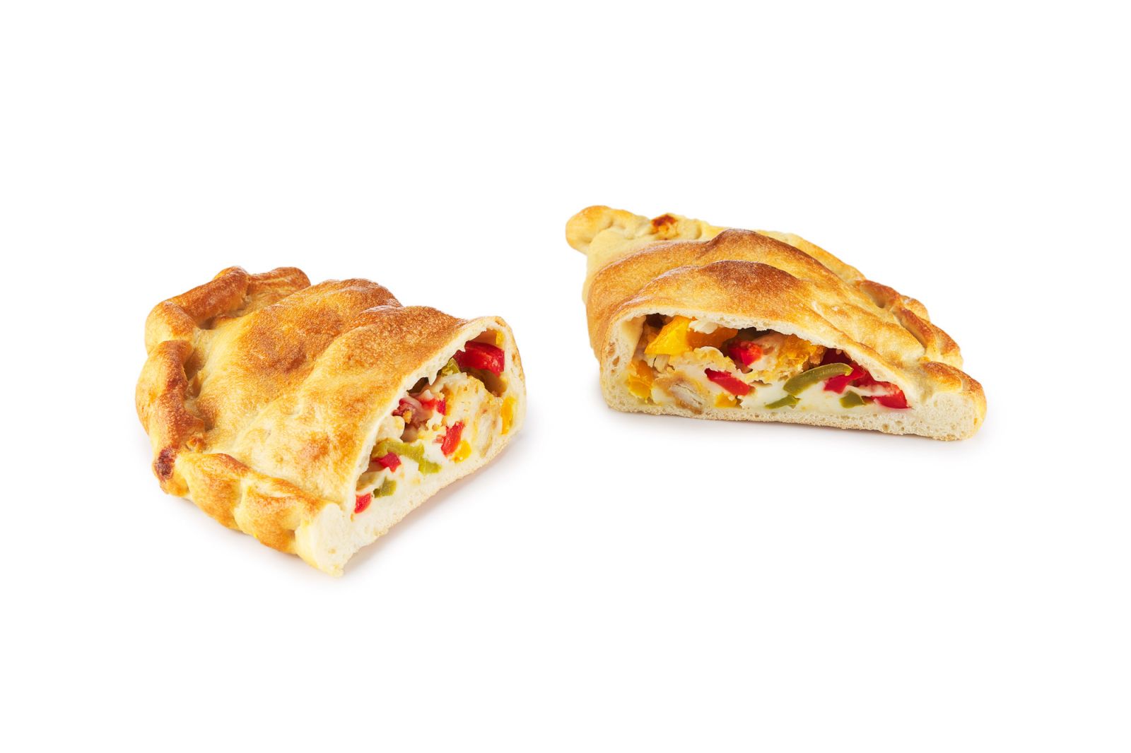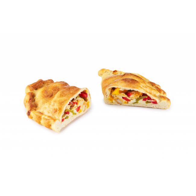 Ciasto pszenne z dodatkiem papryki, cebuli czerwonej, fileta z kurczaka, zielonego ogórka, sosu koperkowego, posypany kukurydza. Zwinięte w kształt pieroga i zapieczone.