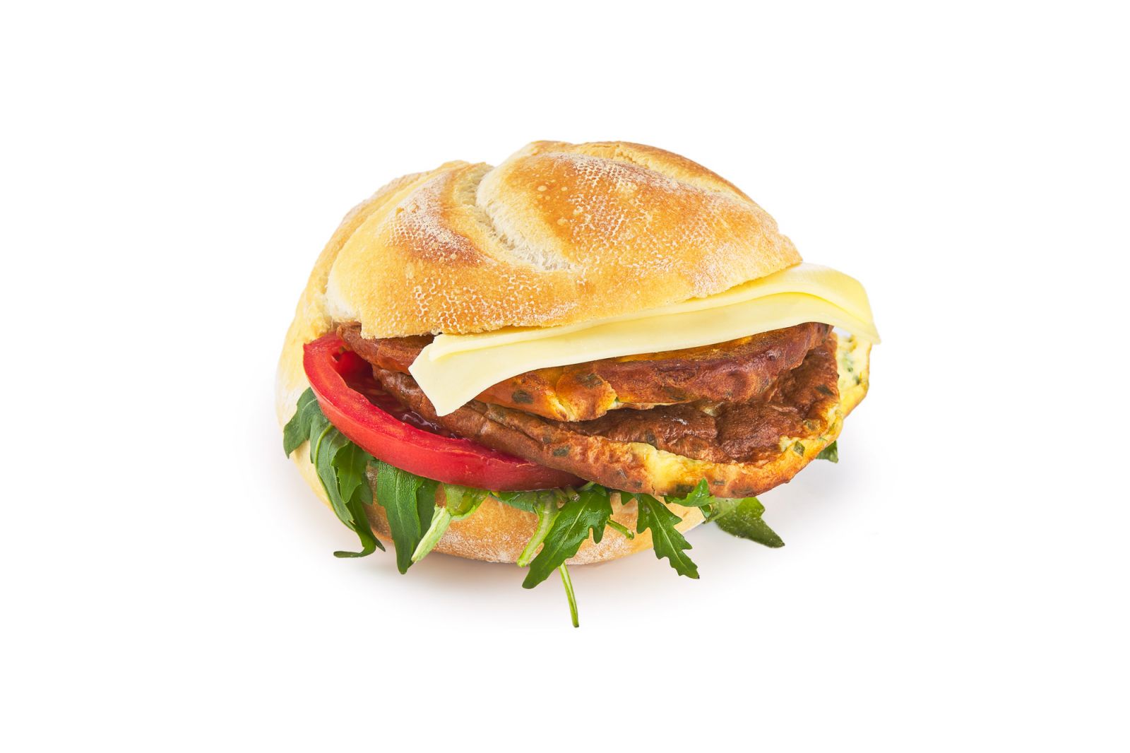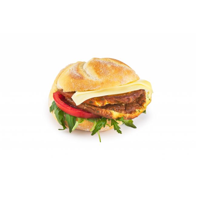 Kanapka na bazie bułki kajzerki przesmarowanej sosem czosnkowo-ziołowym z dodatkiem rucoli, pomidora , zółtego sera. Omlet ze szczypiorkiem idealnie nadaje smak kanapce.