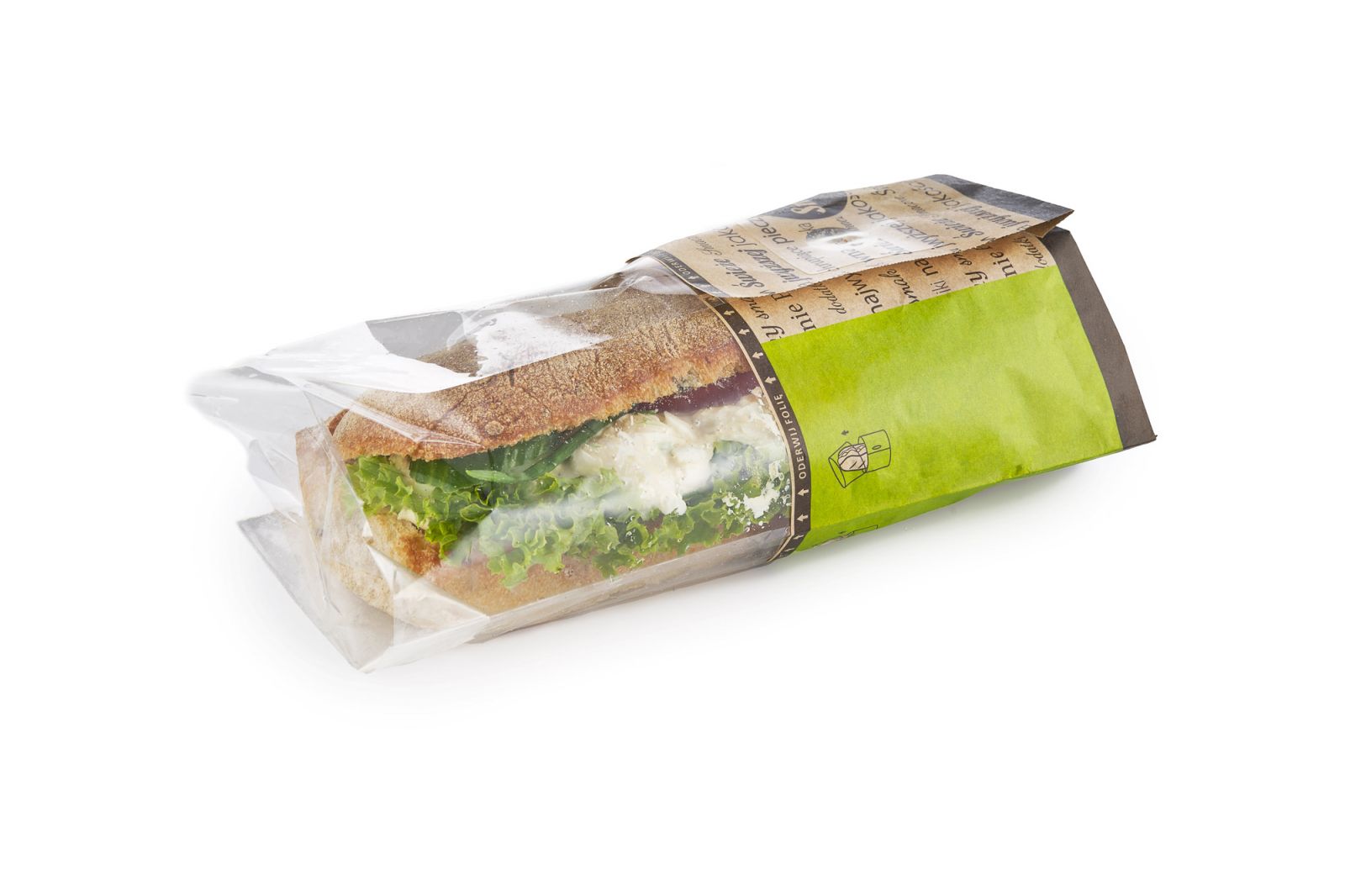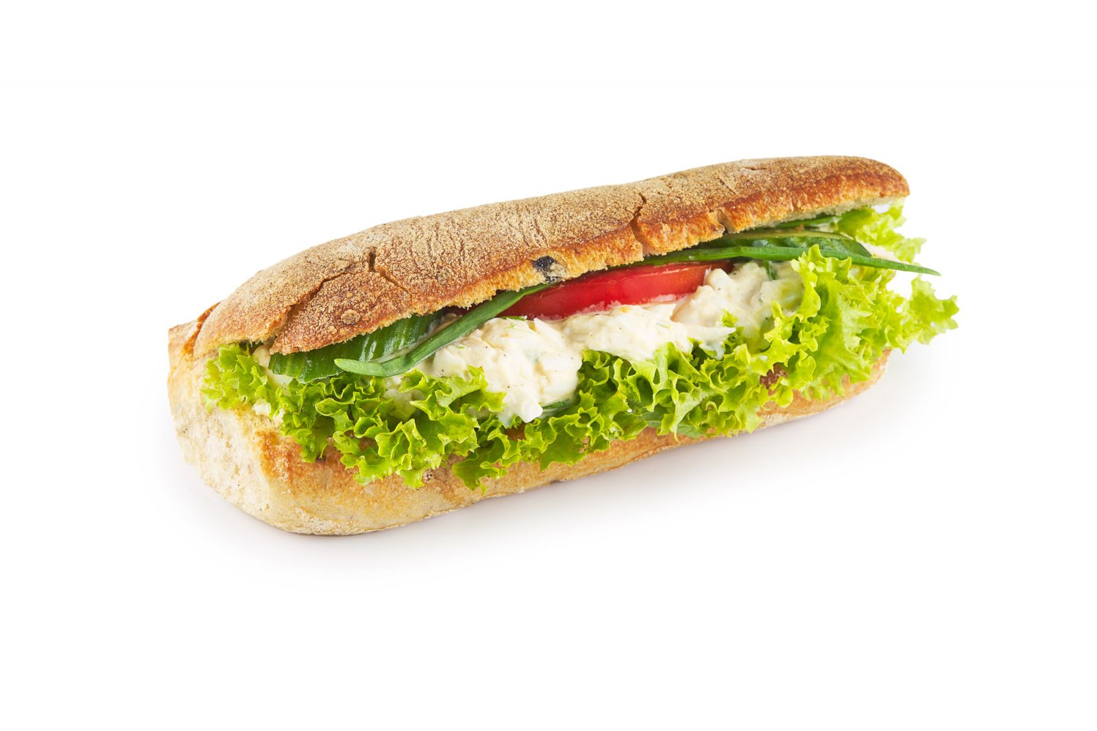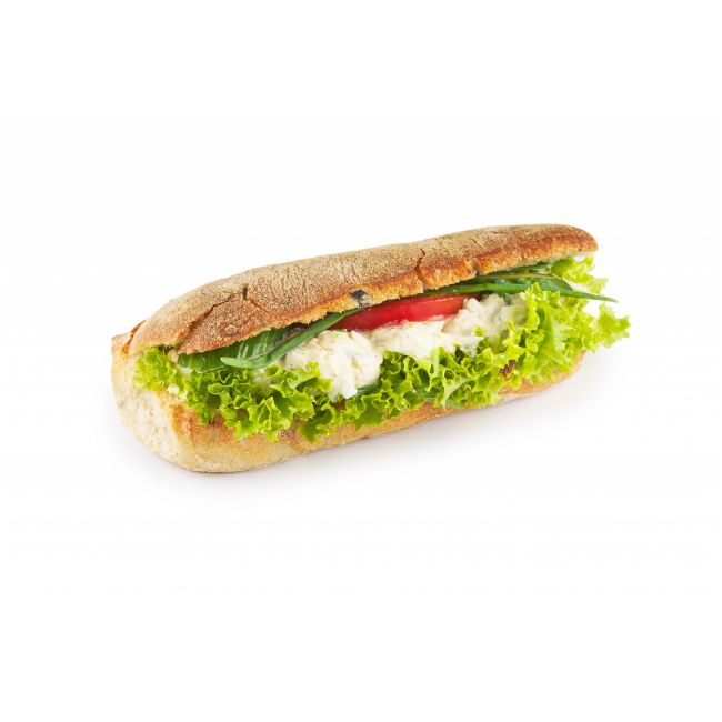 Bułka ciabta z oliwkami z dodatkiem sałaty strzępiastej, pomidora,ogórka zielonego oraz pasty jajecznej.