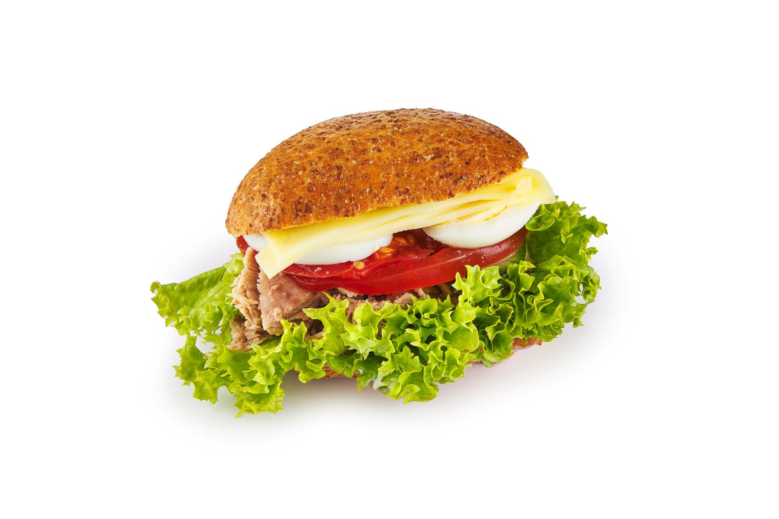 Bułka grahamka przesmarowana sosem czosnkowo-ziołowym, z dodatkiem pomidora, sałaty strzępiastej,ogórka zielonego, Głównym składnikiem jest tuńczyk w sosie własnym. Idealnego smaku dodaje ser zółty.