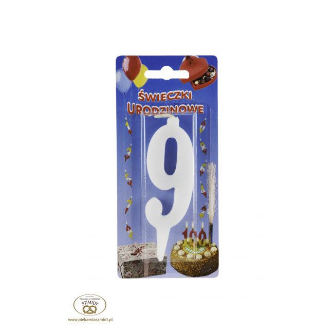 Świeczka w kształcie cyfry dziewięć w kolorze białym. .