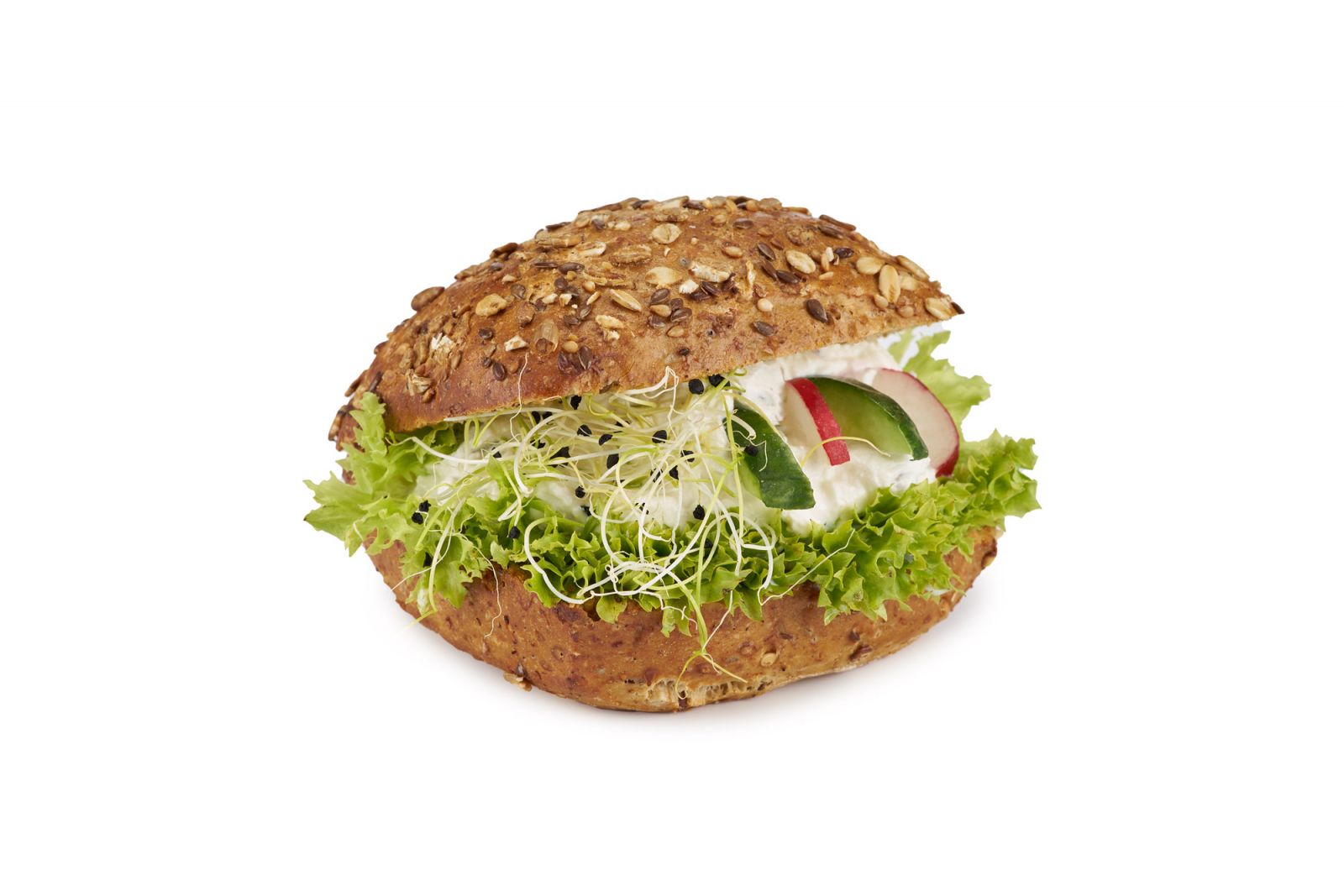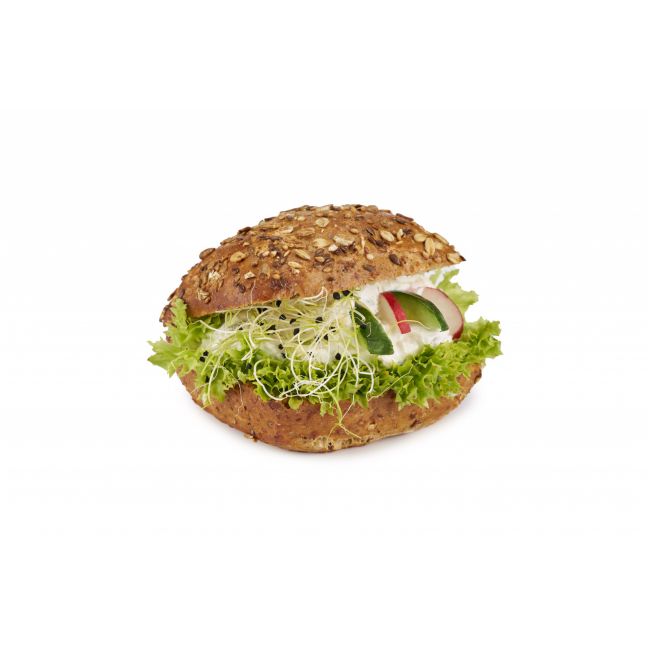 Kanapka z twarożkiem na bułce mini rustal z dodatkiem sałaty strzępiastej i oliwek.