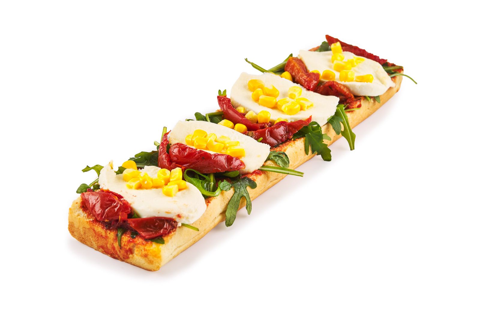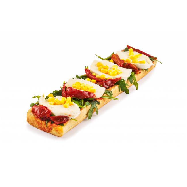 Podłużna bułka przesmarowana sosem do pizzy, z dodatkiem mozzarelli, suszonych pomidorów i rukolii, posypana kukurydzą z nutką ziół prowansalskich.